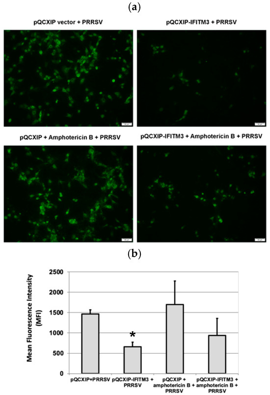 Amphotericin B at a concentration of 2.5 µg/mL was added to each of the six wells of a 48-well plate transfected with either vector control plasmid pQCXIP or IFITM3-HA in triplicate. Another set of six wells transfected similarly was not treated with Amphotericin B. After incubating the plate at 37 °C for 1 h, Amphotericin B was removed. PRRSV 23,983 was added at an MOI of 1 to all wells and the plate was incubated at 37 °C for 24 h. Cells were then fixed with 80% acetone for 20 min at RT and air dried. Next, FITC-conjugated anti-PRRSV Ab specific to N protein (SDOW-17) [26] at a 1:80 dilution was added to each well and incubated at 37 °C for 1 h. The cells were washed and observed using an Olympus IX70 Inverted-Microscope equipped with epi-fluorescence and phase contrast. The cells in each well were scraped, resuspended in PBS, and analyzed by flow cytometry for calculating the mean fluorescence intensity of the FITC staining.