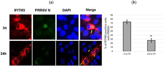 Cells over-expressing exogenous IFITM3 were stained for PRRSV at 3 and 24 hpi. Colocalization of IFITM3 with PRRSV was observed at both time points (Figure 6a). An average 73% of IFITM3-expressing cells contained virus at 3 hpi, while only approximately 27% of IFITM3-expressing cells contained virus at 24 hpi (Figure 6b). Confocal images of IFITM3 over-expressing cells typically showed a few punctuate positive virus staining within isolated individual cells at 24 hpi (Figure 6a). indicative of inefficient cell–cell spread of virus.
