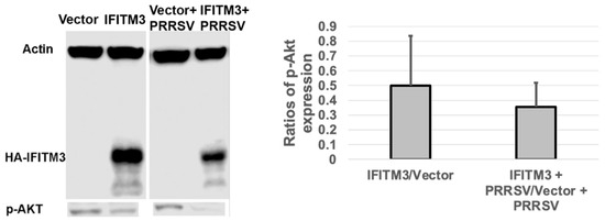 The over-expression of IFITM3 reduces the level of phosphorylated Akt by 50% compared to the vector control. A representative Western blot image shows the expression level of p-Akt. The averages and standard deviations of three replicates are shown in the graph. A significant decrease in the level of p-Akt was observed in IFITM3-over-expressing and PRRSV-infected cells compared to vector-transfected and PRRSV-infected cells (p < 0.05).