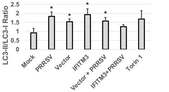 Similarly, a slightly increased LC3II/LC3-I ratio was observed in IFITM3 over-expressing cells compared to vector control cells (Figure 8). A slight decrease in LC3II/LC3-I ratio was observed in PRRSV-infected cells over-expressing IFITM3 than PRRSV-infected cells transfected with vector control (Figure 8). PRRSV infection, vector control transfection, and IFITM3 over-expression all induced a significantly higher ratio of LC3-II/LC3-I than mock cells (p < 0.05).