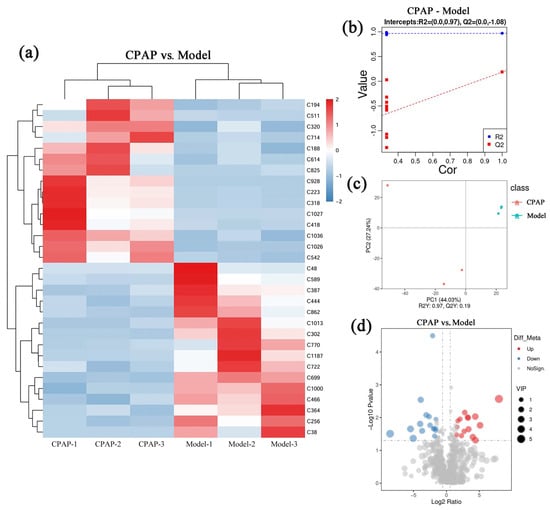 Untargeted metabolomics was employed to quantitatively and qualitatively analyze intestinal metabolites in the mice of the model and CPAP groups. There were 31 metabolites with significant differential expressions, of which 15 were upregulated and 16 were downregulated in the CPAP group compared with the model group. In Figure 2a, the color gradient from blue to red represents increasing metabolite concentrations, providing a visual representation of the differential expression patterns between the two groups. In addition, the specific information of these differential metabolites is provided in Supplementary Table S1. Figure 2b displays the results of partial least squares discriminant analysis (PLS-DA). The R2 value exceeds Q2 and approaches 1, indicating the high explanatory ability and good generalization ability of the model. The Q2 regression line shows a negative intercept on the Y-axis, further confirming the model’s good fit without overfitting [25]. Figure 2c presents the results of principal component analysis (PCA). PC1 and PC2 demonstrate variances of 44.03% and 27.24%, respectively, which suggests that the differences in principal components between groups were significant, indicating the holistic regulatory effects of CPAP on the intestinal metabolic network. Figure 2d shows a volcano plot visualizing the differential expressions of these metabolites between the CPAP and model groups, where red dots represent significantly upregulated metabolites, blue dots indicate significantly downregulated metabolites, and gray dots denote metabolites with no significant changes. Metabolites with a variable importance in projection (VIP) value greater than 1 were identified as key discriminators between the two groups. These results demonstrated that CPAP can significantly regulate the expressions of these intestinal metabolites, while the impacts on physiological functions still require further analysis.