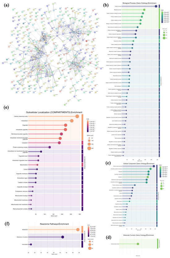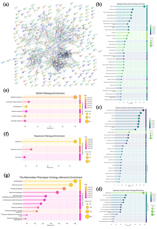 In the leukocytes from the model group, 431 highly expressed proteins were screened and analyzed compared with the CPAP group, and the specific information is displayed in Supplementary Table S4. As shown in Figure 7a, most of the highly expressed proteins in the model group exhibited specific interactions, collectively revealing diverse biological functions and complex regulatory networks. In Figure 7b–d, these proteins are seen to be primarily enriched in 12 biological processes (the cellular process, metabolic process, organic substance metabolic process, cellular metabolic process, primary metabolic process, etc.), 14 cellular components (the cellular anatomical entity, intracellular anatomical structure, organelle, cytoplasm, intracellular organelle, etc.), and nine molecular functions (catalytic activity, small-molecule binding, anion binding, carbohydrate derivative binding, nucleotide binding, etc.), indicating that the uncontrolled growth of solid tumors affected the fundamental cellular activities and metabolic processes of leukocytes [51,52]. As shown in Figure 7e–g, in the KEGG database, these proteins are enriched in six pathways, including metabolic pathways, amyotrophic lateral sclerosis, thermogenesis, Alzheimer’s disease, Parkinson’s disease, and Huntington’s disease, suggesting that solid tumors could suppress the leukocyte activities [53]. In the Reactome database, 3 pathways were enriched, including metabolism, the metabolism of lipids, and hemostasis, while in the Monarch database, 11 pathways were enriched, including mortality/aging, abnormal survival, preweaning lethality, abnormal homeostasis, etc., demonstrating that tumor cell proliferation obviously affects the survival, development, and homeostasis of normal immune cells [54,55]. Therefore, it can be speculated that the malignant growth of solid tumors remarkably disrupts the development and homeostasis of leukocytes, thereby weakening the body’s immune capacities.