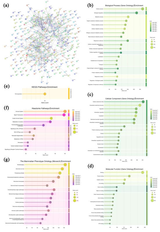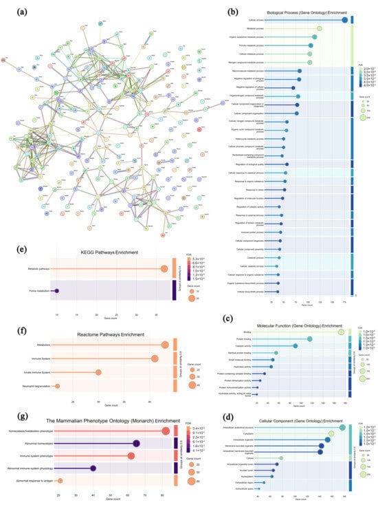 In mouse sera from the model group, 100 highly expressed proteins were selected and analyzed with the specific information presented in Supplementary Table S2, and the associated protein network (Figure 5a) and functional annotation analysis (Figure 5b–d, GO annotation; Figure 5e–g, pathway analysis) are illustrated in Figure 5. As shown in Figure 5a, most of the highly expressed proteins in the model group exhibit specific interactions, with three notable clusterings of proteins in the upper-left and lower-left quadrants. In Figure 5b–d, these proteins are primarily enriched in the 12 biological processes (response to stimulus, metabolic process, organic-substance metabolic process, primary metabolic process, nitrogen compound metabolic process, etc.), seven molecular functions (binding, protein binding, catalytic activity, identical protein binding, enzyme binding, etc.), and six cellular components (the cellular anatomical entity, cytoplasm, cytosol, extracellular region, extracellular space, protein-containing complex, and catalytic complex), which suggests that the cell proliferation in solid tumors occurred at a rapid rate with elevated metabolic activity [43]. As shown in Figure 5e–g, in the KEGG database, these proteins are enriched in 10 pathways, including metabolic pathways, carbon metabolism, proteasome, prion disease, and amyotrophic lateral sclerosis, which indicates that tumor cells enhance protein degradation to maintain intracellular protein homeostasis, supporting their rapid proliferation and survival [44]. In the Reactome database, these proteins were enriched in eight pathways, including the immune system, the innate immune system, metabolism, signal transduction, neutrophil degranulation, etc. Additionally, in the Monarch database, pathways including immune system phenotype and abnormal immune system physiology were enriched. Therefore, it can be inferred that the malignant proliferation of tumor cells leads to the activation of non-specific immunity and the occurrence of inflammatory responses in the body [45].