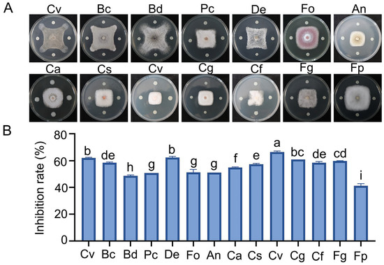 Antagonistic activity of Burkholderia gladioli ZBSF BH07 against pathogenic fungi. (A) Antagonistic assay of B. gladioli ZBSF BH07. Coniella vitis (Cv), Botrytis cinerea (Bc), Botryosphaeria dothidea (Bd), Pestalotiopsis clavispora (Pc), Diaporthe eres (De), Fusarium oxysporum (Fo), Aspergillus niger (An), Colletotrichum aenigma (Ca), C. siamense (Cs), C. viniferum (Cv), C. gloeosporioides (Cg), C. fructicola (Cf), Fusarium graminearum (Fg), and Fusarium pseudograminearum (Fp). (B) Inhibition rate of each microorganism. Data are the mean ± SE (three experiments). Different letters indicate significant differences (p < 0.05) according to Tukey’s test.
