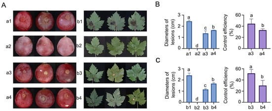 Biocontrol efficiency of B. gladioli ZBSF BH07 against grape white rot. (A) (a1,b1) Inoculation with C. vitis; (a2,b2) culture of ZBSF BH07; (a3,b3) inoculated with C. vitis 24 h after inoculation with the culture of ZBSF BH07; (a4,b4) inoculated culture of ZBSF BH07 24 h after inoculation with C. vitis. Lesion diameters and control efficiency of B. gladioli ZBSF BH07 on grape berries (B) and leaves (C). Letters (a, b, c, and d) above the bars indicate significant differences at p < 0.05 according to Duncan’s multiple range test.