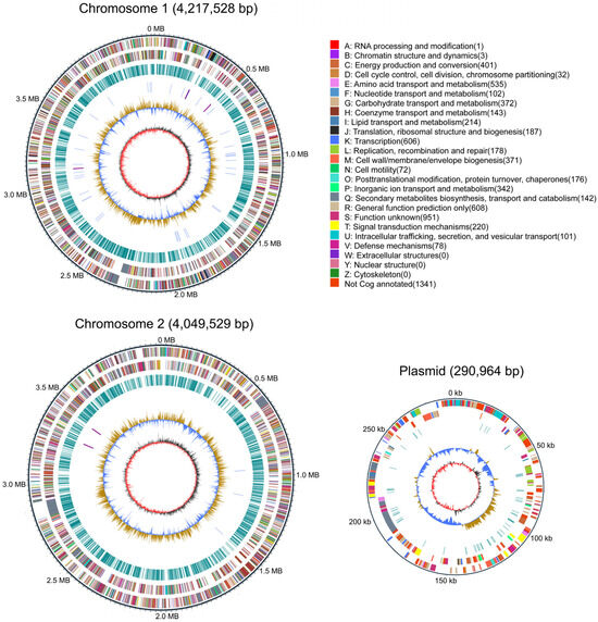 The completed genome of B. gladioli ZBSF BH07 has been shown to be composed of three contigs (contiguous overlapping DNA fragments) assembled into two circular chromosomes (Chr1 and Chr2) and one plasmid (Figure 4). Chr1 contained 4,217,528 bp with 67% GC content, Chr 2 had 4,049,529 bp with 68% GC content, and the plasmid comprised 290,964 bp with 64% GC content. The details of the assembly information and genomic features are summarized in Table S2. A total of 7431 predicted genes were identified in the genome, including 7262 protein-coding sequences, 15 ribosomal RNAs, and 68 tRNAs (Table S2). The genes associated with transcription (8.16%) had the highest density, followed by amino acid transport and metabolism (7.20%), energy production and conversion (5.40%), carbohydrate transport and metabolism (5.01%), cell wall/membrane/envelope biogenesis (4.99%), inorganic ion transport and metabolism (4.60%), lipid transport and metabolism (2.88%), and translation, ribosomal structure, and biogenesis (2.52%). In addition, 25 CRISPRs were involved in ZBSF BH07, and the length of the repeated sequences ranged from 19 to 38 bp (Table S3).
