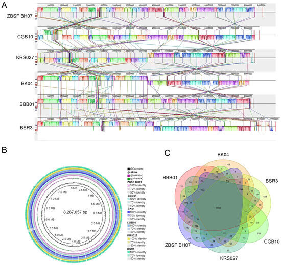 ANI and DDH served as robust metrics for phylogenetic analysis at the genomic level. Strains are considered conspecific when they exhibit ANI > 96% and DDH ≥ 70% [39]. ANI/DDH analysis revealed that ZBSF BH07 had the highest similarity to strain CGB10, with values of 99.27% and 93.7%, respectively. Genomic collinearity (synteny) analysis evaluates structural conservation and gene order similarity across species or strains. This method also identifies conserved genomic regions and strain-specific insertions/deletions, providing insights into biological characteristics and potential applications. Using Mauve, we compared collinearity between ZBSF BH07 and strains CGB10, KRS027, BK04, BBB01, and BSR3. The results revealed high collinearity between ZBSF BH07 and CGB10, corroborating the ANI/DDH findings and supporting the previously established phylogenetic relationships. Gene family analysis elucidates functional diversity and evolutionary history. Comparative analysis of gene families in ZBSF BH07 versus related strains identified both shared and unique gene families.