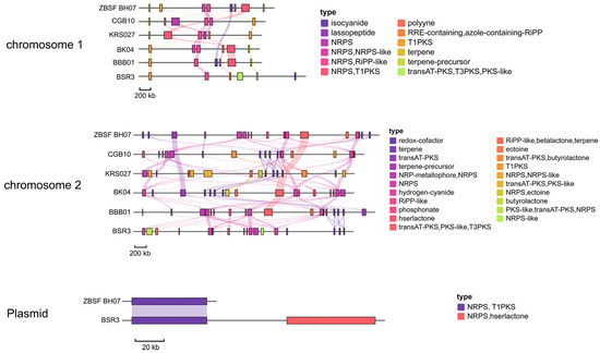 Predicted positions of biosynthetic gene clusters (BGCs) in the genome of Burkholderia gladioli ZBSF BH07 and other B. gladioli as identified by antiSMASH 8.0. The transparent lines represent gene clusters with homologous relationships between different strains.