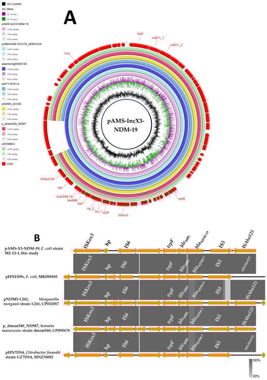 Schematic representation of IncX3 plasmid carrying blaNDM-19 (A), and the genetic environment of blaNDM-19 (B) identified from the genomic sequence of E. coli strain M2-13-1 analyzed in this study. In panel A, six IncX3 plasmids, pJBEHAAB-19-0176_NDM-OXA, plasmid tig00003144, pMTY18781-5, pNDM5_SH160, p_dmsm540_NDM7, and pSCM96-2 carrying blaNDM (accession no. AP028870.1, CP021682.1, AP023210.1, CP053295.1, CP095678.1, and CP028718.1, respectively) have been detected from NCBI GenBank and were included in the figure. The whole sequence of pAMS-IncX3-NDM-19 was used as the reference. The external ring represents the annotation of pAMS-IncX3-NDM-19. The plasmids were included in the following order: pAMS-IncX3-NDM-19 (identified in this study), pJBEHAAB-19-0176_NDM-OXA, plasmid tig00003144, pMTY18781-5, pNDM5_SH160, pSCM96-2, p_dmsm540_NDM7, and pAMS-X3-NDM-19.