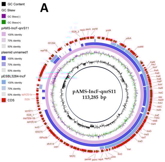 IncF plasmids are (i) one of the most commonly detected plasmid types in Enterobacteriaceae, (ii) frequently of low copy number, (iii) MDR with more than 100 kb in size, and (iv) multireplicon to enhance the replication initiation (FII, FIA, and FIB) []. A BLASTn search with the whole pAMS-IncF-qnrs11 sequence query identified that it has more than 99.1% identity to plasmid unnamed1 isolated from E. coli strain 165 isolated from a patient in the USA in 2015 (76% coverage; GenBank: CP020510.1), and 98.7% identity to plasmid pESBL3284-IncF E. coli strain ESBL3284 (46.8% coverage; GenBank: MW390540.1) (Figure 2A). pAMS-IncF-qnrs11 was successfully transferred by conjugation to E. coli J53. The transconjugant showed resistance to kanamycin (MIC, >256 μg/mL) and tetracycline (MIC, 64 μg/mL) but showed sensitivity to aztreonam (MIC, <2 μg/mL), ciprofloxacin (MIC, 0.5 μg/mL), chloramphenicol (MIC, 4 μg/mL), ceftriaxone (MIC, <2 μg/mL), colistin (MIC, <0.5 μg/mL), meropenem (MIC, <0.5 μg/mL), ertapenem (MIC, <0.5 μg/mL), tigecycline (MIC, <0.5 μg/mL), and fosfomycin (MIC, 4 μg/mL).