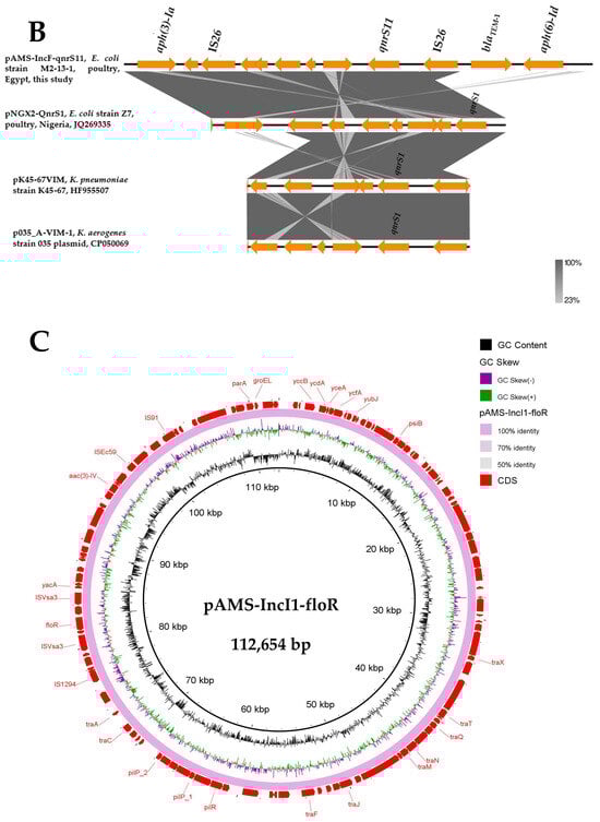 Schematic representation of IncF plasmid carrying qnrS (A), the genetic environment of qnrS11 (B), and IncF plasmid carrying floR (C) identified from the genome sequences of E. coli strain M2-13-1 analyzed in this study. In panel A, two IncF plasmids, plasmid unnamed1 (GenBank: CP020510.1), and plasmid pESBL3284-IncF (GenBank: MW390540.1) have been detected from NCBI GenBank and were included in the figure. The whole sequence of pAMS-IncF-qnrS11 was used as the reference. The external ring represents the annotation of pAMS-IncF-qnrS11. The plasmids were included in the following order: pAMS-IncF-qnrS11 (identified in this study), plasmid unnamed1, and plasmid pESBL3284-IncF.
