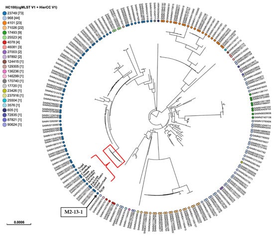 SNPs and hierarchical clustering of cgMLST (HierCC) of the present E. coli isolate ST167 M2-13-1 with the publicly available E. coli isolates ST167 sourced from different hosts in EnteroBase (https://enterobase.warwick.ac.uk/). Tip labels indicate the cgMLST pattern HC100 (allelic differences no more than 100) for ST167. The numbers in brackets indicate the number of isolates assigned to each HC100 cluster. The position of M2-13-1 was marked with a black box and a black arrow. M2-13-1 was grouped with several isolates from different countries and marked with a red triangle and curly bracket.