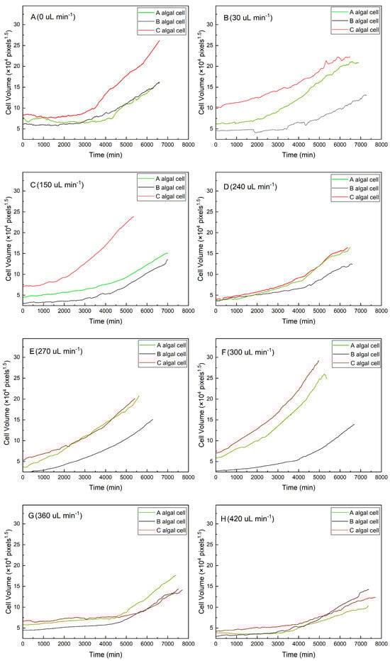 Growth curves for individual algal cells under different flow rates: (A) 0 μL min−1, (B) 30 μL min−1, (C) 150 μL min−1, (D) 240 μL min−1, (E) 270 μL min−1, (F) 300 μL min−1, (G) 360 μL min−1, and (H) 420 μL min−1.