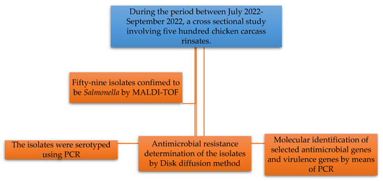 - Naidoo, S.; Butaye, P.; Maliehe, T.S.; Magwedere, K.; Basson, A.K.; Madoroba, E. Virulence Factors and Antimicrobial Resistance in Salmonella Species Isolated from Retail Beef in Selected KwaZulu-Natal Municipality Areas, South Africa. Appl. Sci. 2022, 12, 2843. [Google Scholar] [CrossRef]