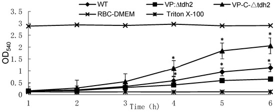 Changes in hemolytic activities of V. parahaemolyticus WT, VP: ∆tdh2, and VP-C-∆tdh2 in RBC-DMEM containing 5% of red blood cells of rabbit at OD540. Red blood cells of rabbit lysed with 2% Triton X-100 and RBC-DMEM were used as the positive and negative control, respectively. The data were obtained in triplicate. “*“ indicates a significant difference (p < 0.05).
