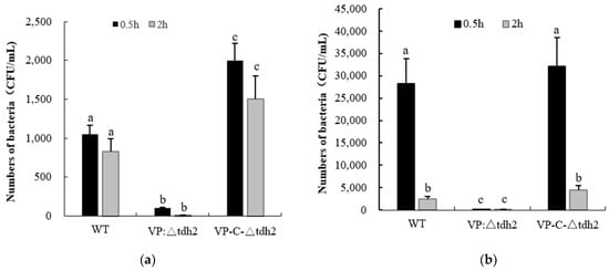 Survival numbers of V. parahaemolyticus WT, VP: △tdh2, and C-△tdh2 in LBNB with pH 3 (a) and pH 4 (b) at 37 °C for 0.5 h and 2 h. The data were obtained at least in triplicate. There is a significant difference (p < 0.05) between numerical values marked with different superscripts (a, b, c).