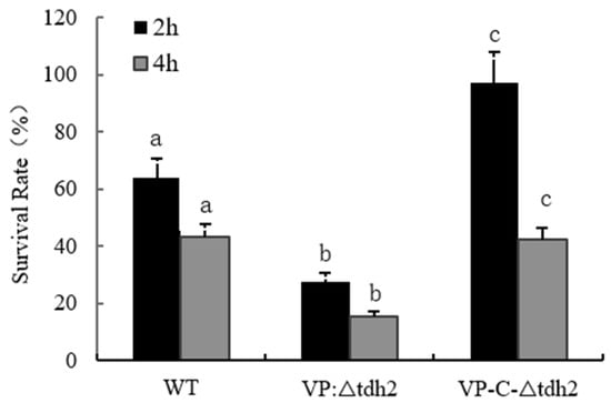 Survival rates of V. parahaemolyticus WT, VP: △tdh2, and C-△tdh2 in LBNB with 2% of bile salt at 37 °C for 2 h and 4 h. The survival rate was determined as “colonies on the plate/the number of inoculation × 100%”. Data were obtained at least in triplicate. There is a significant difference (p < 0.05) between numerical values marked with different letters.