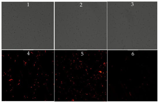 Inverted microscope observations of V. parahaemolyticus treated with 0.9% of bile for 2 h at 37 °C (1–3: observations of WT, VP: △tdh2, and VP-C-△tdh2 under white light; 4–6: observations of WT, VP: △tdh2, and VP-C-△tdh2 under fluorescent light). The scale bar is 50 μm. The samples were mixed with 10 μL of PI (1 mg/mL) at 37 °C for 20 min without light.
