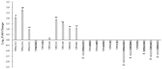 The log2-fold change of the relative expression levels of 22 genes in V. parahaemolyticus VP: △tdh2 compared with the WT at 37 °C for 12h in LBNB. The relative mRNA expression levels of each gene normalized to 16s–23s rDNA expression were calculated by using the 2−ΔΔCt method. Genes with a p-value < 0.05 and a differential expression fold change ≥ 1.5 (log2-fold change ≥ 0.585) are significantly differentially expressed. “*” and “**” indicate significant differences from V. parahaemolyticus WT at p < 0.05 and p < 0.01. The data were obtained at least in triplicate. All data are presented as mean ± SD.