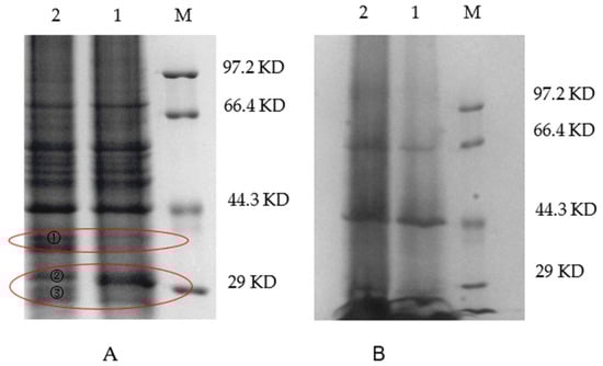 SDS-PAGE electrophoresis of the cells (A) and supernatant (B) of V. parahaemolyticus in LBNB at 37 °C for 18 h (M: protein makers; 1: WT; 2: VP: △tdh2). Band 1, 2, and 3 on land 2 in red circle were different bands compared with WT. Band 3 was cut off for LC-MS analysis.