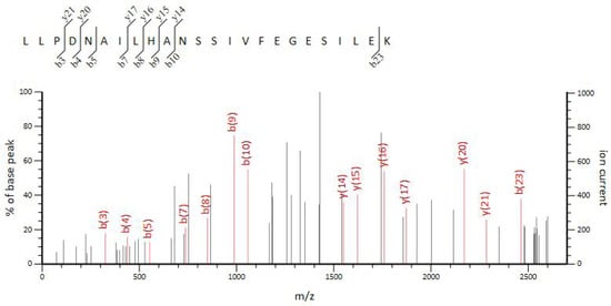 Correspondingly, differences in protein expression between the WT and VP: △tdh2 were examined via SDS-PAGE for both cellular and secreted proteins. The supernatant protein profiles of VP: △tdh2 and the WT were nearly identical, but the cellular protein patterns differed. Three protein bands, with molecular weights between 29 kDa and 44.3 kDa, showed changes in VP: △tdh2 (Figure 6A). These were labeled as bands 1, 2, and 3. Band 1 showed increased expression, band 2 showed decreased expression, and the ~29 kDa band 3 was absent in the WT. LC-MS analysis suggested that band 3 was likely an ABC transporter ATP-binding protein (Figure 7), while bands 1 and 2 were predicted hypothetical proteins. This result aligned with the RT-qPCR findings, which showed significantly upregulated expression of two ABC transporters—VP0301 and VP1995—in VP: △tdh2. The elevated expression of these ABC transporters, which are located on the cell membrane of V. parahaemolyticus, might enhance the efflux of harmful substances, providing increased resistance to acid and bile stress in the absence of tdh2.
