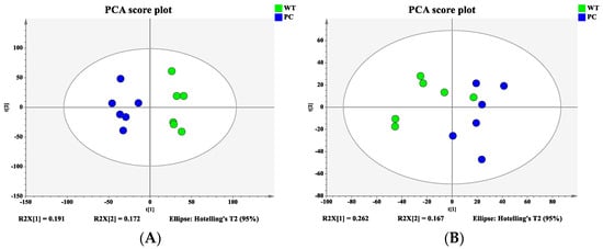Principal component analysis (PCA) score plot: (A) ESI+; (B) ESI−.