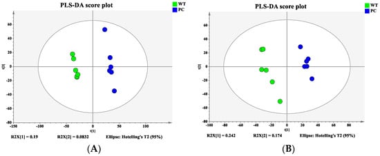Partial least squares discriminant analysis (PLS-DA) score plot: (A) ESI+; (B) ESI−.