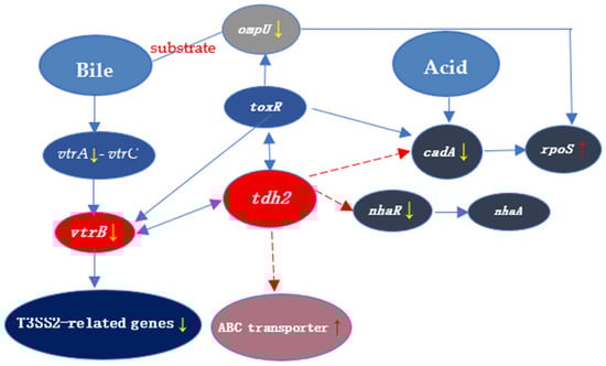 The transcriptional relationship between tdh2 and the 8 genes involved in our study. The red and yellow arrows indicate upregulation and downregulation of the expression, respectively. The dashed and solid lines represent unknown and well-studied regulation, respectively. V. parahaemolyticus senses bile salts by a 1:1 complex formed by VtrA and VtrC. Bile acids such as TDC and CDC can bind to the hydrophobic pocket in the VtrA-VtrC complex. Then, VtrA binds to the 284 bp promoter region of vtrB, which in turn binds to promoters of tdh2 and Vp-PAI to induce the expression of tdh2 and T3SS2-related genes. There is currently no evidence for the direct regulatory relationship between genes (ompU and rpoS) and tdh2. OmpU is regulated by toxR directly and then activates the rpoS expression. After the deletion of tdh2, the expression changes of ompU and rpoS may be related to toxR, which can directly bind to the promoter region of tdh2. VP2890 (cadA) is an acid-sensing signaling factor that can directly bind to acids, as well as regulate the rpoS expression. ABC transporters may indirectly regulate tdh2 by the quorum sensing system or a new two-component system. The regulatory relationship between ABC transporters and tdh2 needs further study.