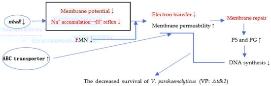 The speculation about the decreased survival of V. parahaemolyticus (VP: △tdh2). The red and black words indicate speculation and confirmed results in this study, respectively. ↑ and ↓ represent upward and downward, respectively.