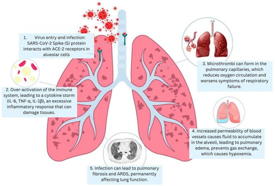In severely affected patients, SARS-CoV-2 infection of the lower respiratory tract triggers a dysregulated immune response, leading to diffuse alveolar damage, increased alveolar–capillary permeability, and widespread inflammation and coagulopathy [4]. However, although lung pathology constitutes the most frequent data, COVID-19 represents a systemic illness: direct viral damage, hyperinflammation, and endotheliopathy may involve many other organ systems [5]. SARS-CoV-2 can enter the cells of the body with the help of its spike glycoprotein [6]. The S1 subunit of the spike links to the receptor on target cells, angiotensin-converting enzyme 2 (ACE2), and the S2 subunit facilitates viral envelope-to-cell membrane fusion [6,7]. The spike must be cleaved by a host cell protease (TMPRSS2 on respiratory epithelial cells) at the S2 site to activate membrane fusion and permit entry of the viral RNA into the cytoplasm [8]. Within the respiratory system, the virus infects ciliated cells in the nasopharynx and the trachea, which, unable to be contained early by the immune system, can eventually infect the alveoli [9]. The primary target in the lungs is alveolar type II pneumocytes that highly express ACE2 [4]. The functional role of these cells is to secrete the surfactant, but they are also alveolar repair progenitors; thus, their infection and SARS-CoV-2 destruction help undermine the alveolar structure and recovery [10]. The virus then replicates itself once inside the cell, resulting in the formation of double-stranded RNA intermediates, which trigger host defenses against viruses [10]. The stimulation of the innate immune sensing pathways sensitizes SARS-CoV-2 infection and exports interferons and pro-inflammatory cytokines [11]. Pattern recognition receptors identify viral RNA (e.g., RIG-I, MDA5, and endosomal TLRs) and induce the generation of type I/III interferons (IFNs) and tens of interferon-stimulated genes with antiviral effects [12]. This coordinated innate response is responsible for infection in many patients. Nevertheless, the late and dysfunctional early interferon response defines severe COVID-19, when viral replication and antigen loads are maximal [13]. The outcome is a cytokine storm, overenthusiastic immune stimulation with an increase in interleukins (IL-1b and IL-6), tumor necrosis factor (TNF), and other inflammation factors [14]. SARS-CoV-2’s downstream activation of the NLRP3 inflammasome in macrophages results in both the overproduction of IL-18 and cell death (pyroptosis) due to an inflammatory mechanism, which also enhances tissue injury at localized sites [15,16]. The infected lungs are highly infiltrated by neutrophils and monocytes, which liberate proteases, reactive oxygen species, and chemokines, which damage alveolar structures [17]. In the meantime, T cells and natural killer (NK) cells can develop pathological cytotoxic activity, which can lead to immunopathology [18]. In general, there is a high propensity to blunt the adaptive immune response in critical illness, and an exuberant innate inflammatory cascade results in collateral damage to lung tissue and other organs. Diffuse alveolar damage is the diagnostic histopathological feature of severe COVID-19 pneumonia and the prototypical lesions of ARDS [19]. Diffuse alveolar damage (DAD) includes damage to the alveolar epithelium and endothelium in capillaries in large areas; the acute exudative stage is manifested by interstitial edema of the lungs and intra-alveolar edema, a fibrinous hyaline membrane covering alveoli, and pneumocyte necrosis [20]. In COVID-19 autopsies, lungs generally exhibit DAD in exudative and early proliferative stages, which consist of proteinaceous edema, hyaline membranes, massive loss of type I and type II pneumocytes, congested capillaries with microthrombi, and hyperplasia of the surviving type II cells as a failed organization repair attempt [21]. In these pathological alterations, there is a relationship with the clinical picture of ARDS: refractory hypoxemia and poor compliance. The intense leakage of fluid into air spaces results from damage to the alveolar–capillary barrier [10]. Gas exchange is grossly affected by the flooding of alveoli and the development of deposits of hyaline membranes [22,23]. The death of functional type II cells also leads to the loss of surfactant, which supports alveoli collapse (atelectasis) [24]. Some patients with DAD develop fibrotic lung evolution after the acute stage of the disease despite life-saving recovery, which could cause long-term pulmonary fibrosis effects [25]. A notable characteristic of COVID-19 ARDS is severe coagulopathy in the lungs. SARS-CoV-2 infection has been shown to result in the destruction of lung tissue, accompanied by endothelial dysfunction and abnormal clotting, leading to microvascular thrombosis (Figure 1). The development of pulmonary embolism contributes to exacerbated hypoxia, resulting in additional damage to the lungs [26,27]. The presence of signs consistent with disseminated intravascular coagulation (DIC) has been observed in patients, resulting in abnormal blood clotting throughout the body. This has been linked to bleeding complications and thrombosis [28,29]. The pulmonary microcirculation can become pro-thrombotic, which is caused by endothelial injury and inflammatory mediators [30]. Severe COVID-19 cases often have fibrin-rich microthrombi in the small pulmonary arterioles and capillary structures [31]. A damaged endothelium leads to the production of tissue factor and stimulates extrinsic clotting, whereas pro-inflammatory damage liberates intracellular DAMPs, triggering the intrinsic clotting pathway [32]. Platelets aggregate at sites of vascular injury and, together with leukocytes, form intravascular thrombi. Neutrophils also secrete multi-stranded, structured DNA, protein molecules called neutrophil extracellular traps (NETs) that can trap platelets and directly initiate the coagulation p