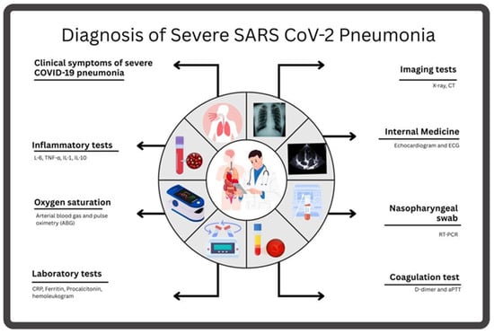 If bacteremia is suspected, blood cultures may be obtained to identify secondary bacterial infections. Severe COVID-19 pneumonia leads to elevated white blood cell counts due to inflammation, while some patients display lymphopenia [70]. Elevated C-Reactive Protein (CRP) levels are a marker of systemic inflammation and can be used to monitor disease severity and response to treatment [71,72]. Ferritin measures inflammation, therefore, its levels increase when patients experience severe disease [73]. Procalcitonin may be normal or slightly elevated, and it is used to rule out bacterial coinfection [74] (Figure 2). Elevated D-dimer levels are associated with hypercoagulability and indicate the possibility of microvascular thrombosis or a dangerous condition known as disseminated intravascular coagulation (DIC), which can affect severe COVID-19 cases [75]. The tests evaluate liver and kidney health to determine whether COVID-19 has spread to multiple body organs, since severe COVID-19 cases commonly affect multiple organs.