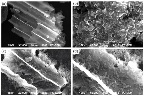 SEM image of immobilized bacteria. (a) Morphology of biochar under SEM at 2000× magnification. (b) Morphology of Pseudomonas aeruginosa under SEM at 5000× magnification. (c) Morphology of immobilized bacteria under SEM at 2000× magnification. (d) Morphology of immobilized bacteria under SEM at 5000× magnification.