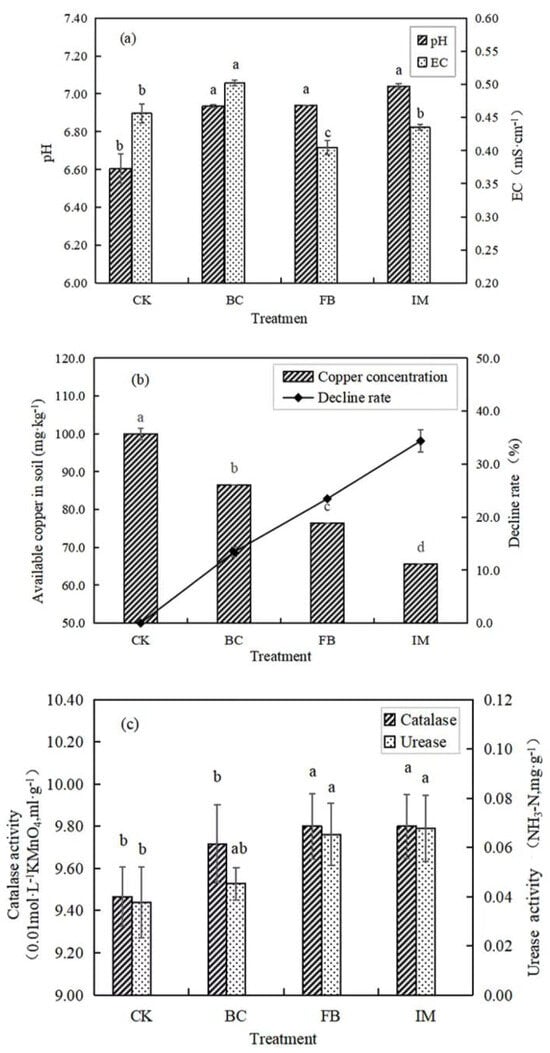 Effects of different treatments on EC and pH of soil (a), available copper content in soil (b), and soil enzymatic activities (c). Different lowercase letters after the data indicate a significant difference between treatments (p < 0.05).