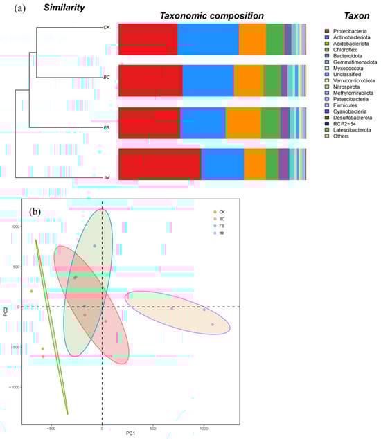 The sequencing coverage of all the treatment groups was higher than 97.7%, suggesting that the sequencing depth was sufficient to meet the subsequent analysis requirement. By ranking the treatments in accordance with the Shannon index and evenness, the orders were both the same as IM < FB < CK < BC (p < 0.05). Based on the Simpson index, the order was BC = FB < CK < IM (Table 1). Clearly, the treatment IM could reduce the alpha diversity of soil bacteria, while BC could improve it.