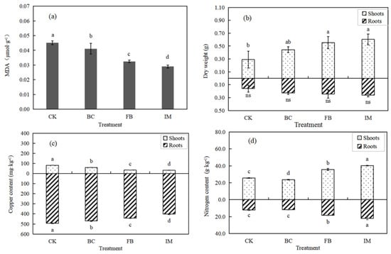 Effect of treatments on Chinese milk vetch. (a) MDA content in leaves. (b) Dry weight of roots and shoots. (c) Copper content in shoots and roots. (d) Nitrogen content in shoots and roots. Different lowercase letters indicate a significant difference between treatments (p < 0.05), and “ns” indicates no significance (p > 0.05).