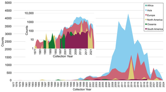 Global counts of NPEV sequences from clinical surveillance data. Data was obtained from the BV-BRC database for samples collected between 1977 and 2024. Inset is the log transformed data.