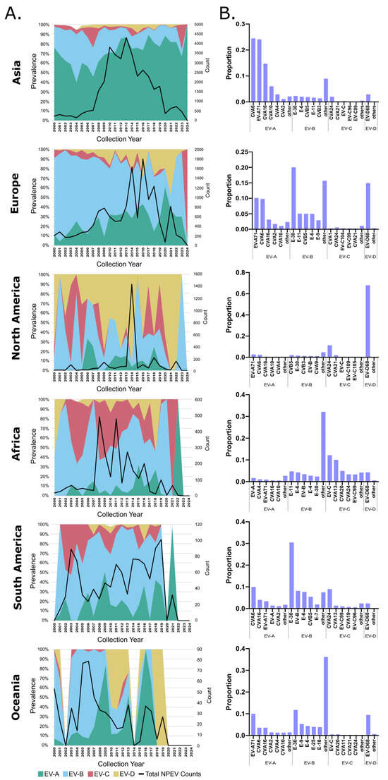 To determine whether the global NPEV trends reflected the regional trends, we subdivided the data into six geographical groups delineated within the dataset (North America, South America, Africa, Asia, Europe and Oceania). This dataset represented collections between 2000 and 2024 because it largely consisted of more than >500 entries per year. We found clear regional-specific trends over time (Figure 3A). Notably, EV-A remained the dominant NPEV species in Asia, accounting for more than 75% of all detections from 2012 onwards. In turn, the EV-B species was dominant in Europe and South America, with notable spikes of EV-A in select years. In North America, the EV-D species was by far the dominant NPEV species detected. In Africa, both the EV-B and EV-C species contributed to the largest prevalence, while a mixture of the EV-A, EV-B and EV-D species was seen in Oceania.