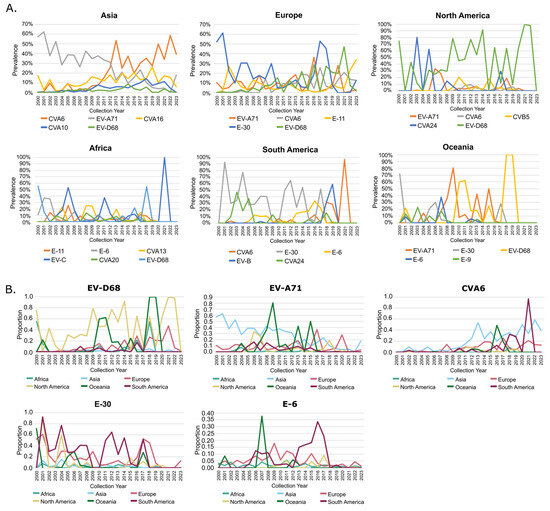 To investigate the temporal shifts and highlight regional-specific peaks of NPEVs that likely corresponded to regional outbreaks, we evaluated the top five dominant NPEV genotypes detected between 2000 and 2023 for each region. In Asia, we noted a progressive temporal switch from the dominant EV-A71 to CVA6 in 2012–2013. Although other NPEV genotypes were responsible for certain peaks in activity, most were found to maintain a prevalence below 20% over this time period (Figure 4). Conversely, E-30 predominated all other genotypes in Europe, surpassing 50% prevalence in 2001 and then again in 2017. EV-D68, although generally not readily detected, did surpass 20% prevalence in several successive years (i.e., 2014, 2016, 2018 and 2021). In North America, EV-D68 detections comprised the largest proportion of data across this time period, with clear spikes in detection across many years. In Africa, the most dominant recently detected genotype was EV-D68, spiking in 2016 and 2018. However, the EV-C species that were not resolved into genotypes contributed to a large proportion of data from this region. In South America, E-30 predominated detections up to 2017. Subsequently, CVA6 detections peaked in 2018, 2019 and 2021, while moderate prevalence (up to 30%) was observed for E-6 from 2013–2017. Similarly to Africa, the untyped EV-B species comprised a large proportion of data between 2018 and 2019. In Oceania, EV-A71 and EV-D68 predominated from 2008 onwards with a notable spike of E-30 in 2017.