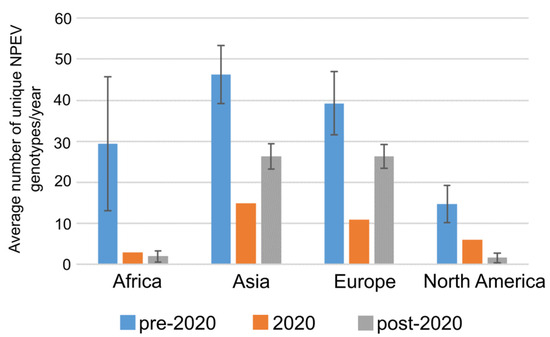 Genotype complexity of NPEVs were decreased as a result of the COVID-19 pandemic. Regional decrease in the number of unique genotypes detected during (2020) and post COVID-19 pandemic (post-2020). Graph represents average number of unique NPEVs detected per year for pre-2020 (2013–2019), 2020 and post 2020 (2021–2023). Standard deviation of the mean is depicted for pre-2020 and post-2020 datasets.