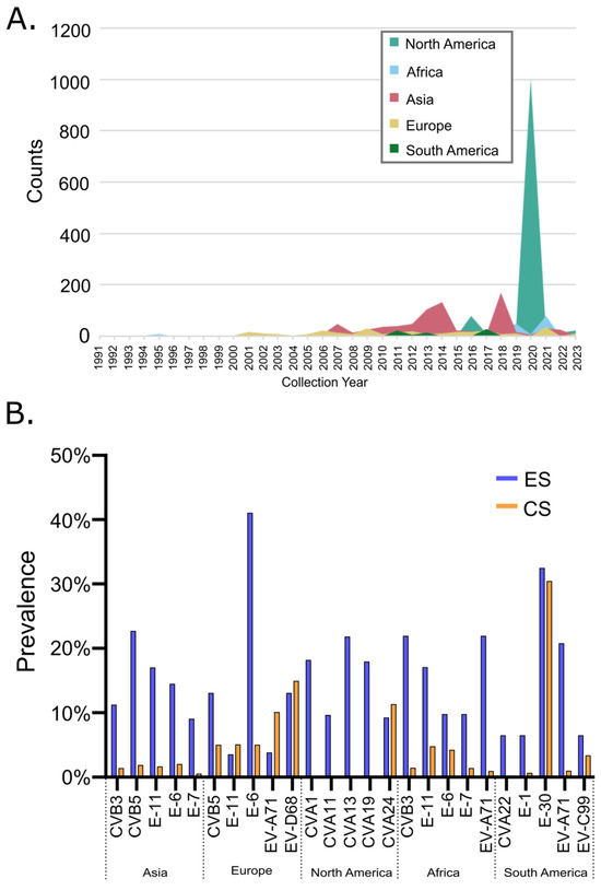Publicly available data pertaining to environmental surveillance (ES) is relatively sparse globally (Figure 6A), accounting for a total of 2589 sequences and amassing generally less than 100 NPEV counts per year. A clear spike in NPEV environmental surveillance activities can be observed in North America in 2020, amounting to ~1000 NPEV entries. Although sampling for certain regions appears to be more consistent (spanning >5 successive years), we did not evaluate this data to the granularity of specific countries or cities to determine if the same sites were being sampled over multiple years due to the overall sparsity of the data. To determine whether the total environmental surveillance data aligned with the detections observed through clinical surveillance, we identified the top five dominant NPEVs that were detected between 2000 and 2023 for each geographical region in order to determine whether the same genotypes were identified within the clinical dataset. We found that in select geographical regions, the environmental surveillance data did somewhat trend with the clinical surveillance data. Collectively, three of the top NPEVs detected through clinical surveillance (E-30, EV-D68 and EV-A71) were also one of the top five detected through environmental sampling in some of the geographical regions (Figure 6B). In Europe, EV-D68 was detected at a comparable prevalence of ~15% by both clinical and environmental surveillance activities. Similarly, in South America, E-30 was detected at similar prevalence of ~30% while in North America CVA24 was detected at ~10% in both clinical and environmental surveillance sources. However, a large proportion of data collected by environmental surveillance for Asian, North American and African regions do not represent clinical data.
