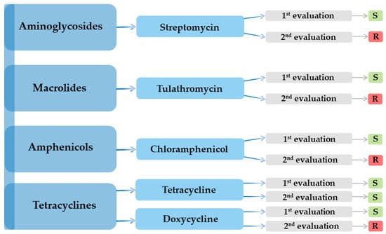 Serial testing revealed a precipitous loss of activity, so streptomycin, tulathromycin, chloramphenicol, and doxycycline all flipped from susceptible to resistant between evaluations, leaving tetracycline as the sole agent retaining efficacy (Figure 1).