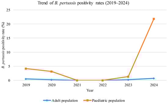 The Cochran–Armitage trend test revealed a statistically significant upward trend in B. pertussis positivity rates over time in both adults (Z = 2.14, p = 0.032) and pediatric patients (Z = 5.87, p < 0.001), confirming the descriptive observation of increased incidence in 2024.