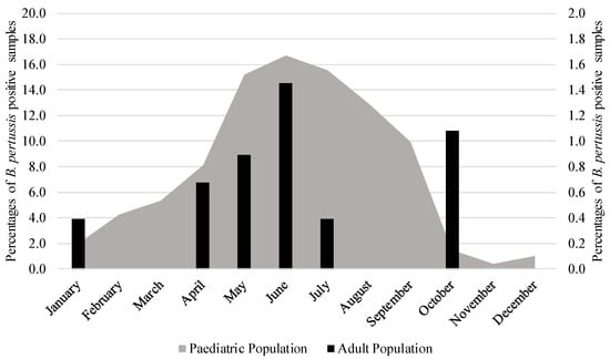 Percentage of Bordetella pertussis-positive samples from adult and pediatric populations in 2024.