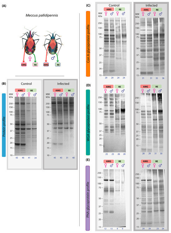 Protein and glycosylation profiles of AMG and RE samples from female and male M. pallidipennis uninfected and infected with T. cruzi. (A) AMG and RE of female and male M. pallidipennis. (B) AMG and RE protein profiles by SDS-PAGE. (C) AMG and RE glycosylation profile by ConA. (D) AMG and RE glycosylation profile by WGA. (E) AMG and RE glycosylation profile by PNA. MW = molecular weight; kDa = kilodaltons; AMG: anterior midgut; RE: proctodeum. The total number of bands identified in each experimental group is given at the bottom of each profile.