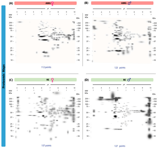 Proteomic maps of AMG and RE samples showed quantitative and qualitative (intensity) differences between the sexes in the infected group. In the AMG samples, infected females presented 112 protein spots, with 58 unique spots (13–250 kDa, IP of 3.14–9.99), whereas males showed 123 spots, with 69 unique spots (16–250 kDa, IP of 3.02–9.96) (Figure 2A,B). In contrast, 157 spots with 126 unique spots (10–250 kDa, IP of 3.05–9.96) were identified in the RE samples of females, while 127 spots, with 96 unique spots (10–250 kDa, IP of 3.05–10), were observed in males (Figure 2C,D). Fifty-four common protein spots were detected in the AMG samples and 31 in the RE samples from infected triatomines of both sexes.