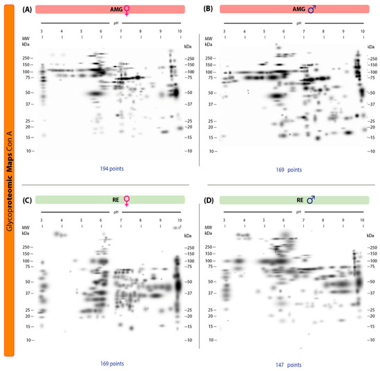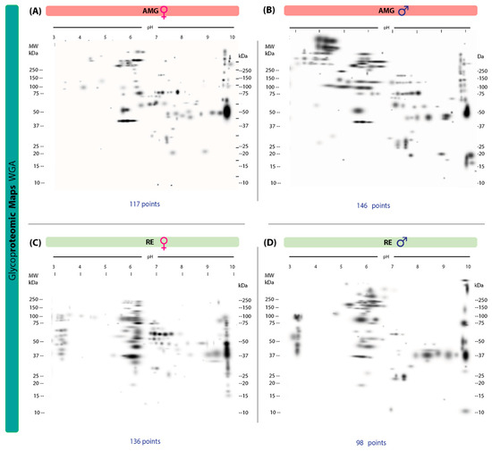 Glycosylation analysis by affinity with WGA identified 28 bands in the AMG samples of females and 29 in those of males, with molecular weights ranging from 10 kDa to 250 kDa. In the RE samples, 31 bands were detected in females and 30 in males, with molecular weights ranging from 11 kDa to 250 kDa. In the RE samples, two bands of 32 and 54 kDa were identified in females, while one band of 122 kDa was detected in males. In addition, a band at 90 kDa was observed with greater intensity in males than in females, while the band at 60 kDa was more intense in females than in males (Figure 1D).