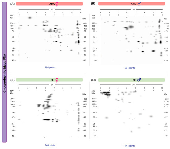 Ninety-one protein spots and 71 unique spots, with molecular weights ranging from 11–250 kDa and IP values of 3.00–9.99, were identified in the 2D lectin blots revealed by PNA of AMG samples from infected females (Figure 5A). In infected males, 72 protein spots and 52 unique spots with molecular weights in the same range (11–250 kDa) and IP values of 3.00–9.97 were detected (Figure 5B). Of these, 20 spots were shared by both sexes. In RE samples, females showed 74 spots with 70 unique spots (10–250 kDa, IP of 3–10) (Figure 5C); infected males showed 51 spots with 47 unique spots (14–250 kDa, IP of 3–9.84) (Figure 5D). Four spots shared by both sexes were detected.