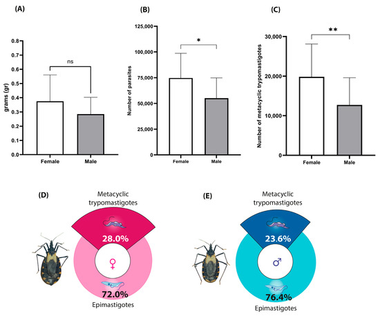 Similarly, the metacyclogenic index was significantly higher in females (28%) than in males (23.6%) (U = 52, p = 0.0350; Figure 6D,E). This translated to an estimated 19,841 metacyclic trypomastigotes in females and 12,725 in males (Figure 6C), supporting a sex-associated difference in the efficiency of metacyclogenesis within the vector.