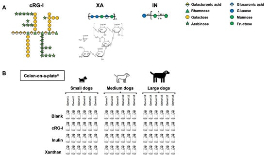 Elements of study design. (A) Chemical structures of test fibers. (B) Experimental setup. cRG-I, carrot rhamnogalacturonan-I; IN, inulin; XA, xanthan.