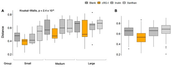 The alpha diversity, a measure for species richness, was maintained for all the test products compared to the blank (Figure 2A). The beta diversity, a measure for the dissimilarity between donors within a treatment group, was significantly decreased in the cRG-I group compared to the blank (Figure 2B), suggesting that cRG-I has a stabilizing effect on the gut microbiota of dogs by lowering the interindividual differences. The beta diversity index for inulin and xanthan remained unchanged compared to the blank.